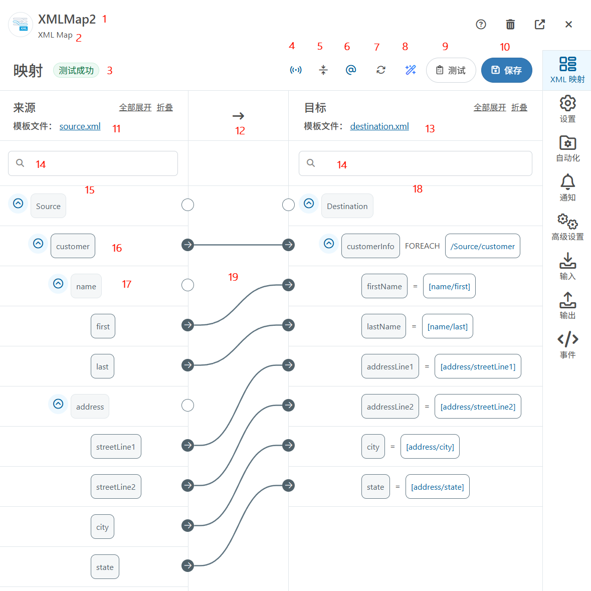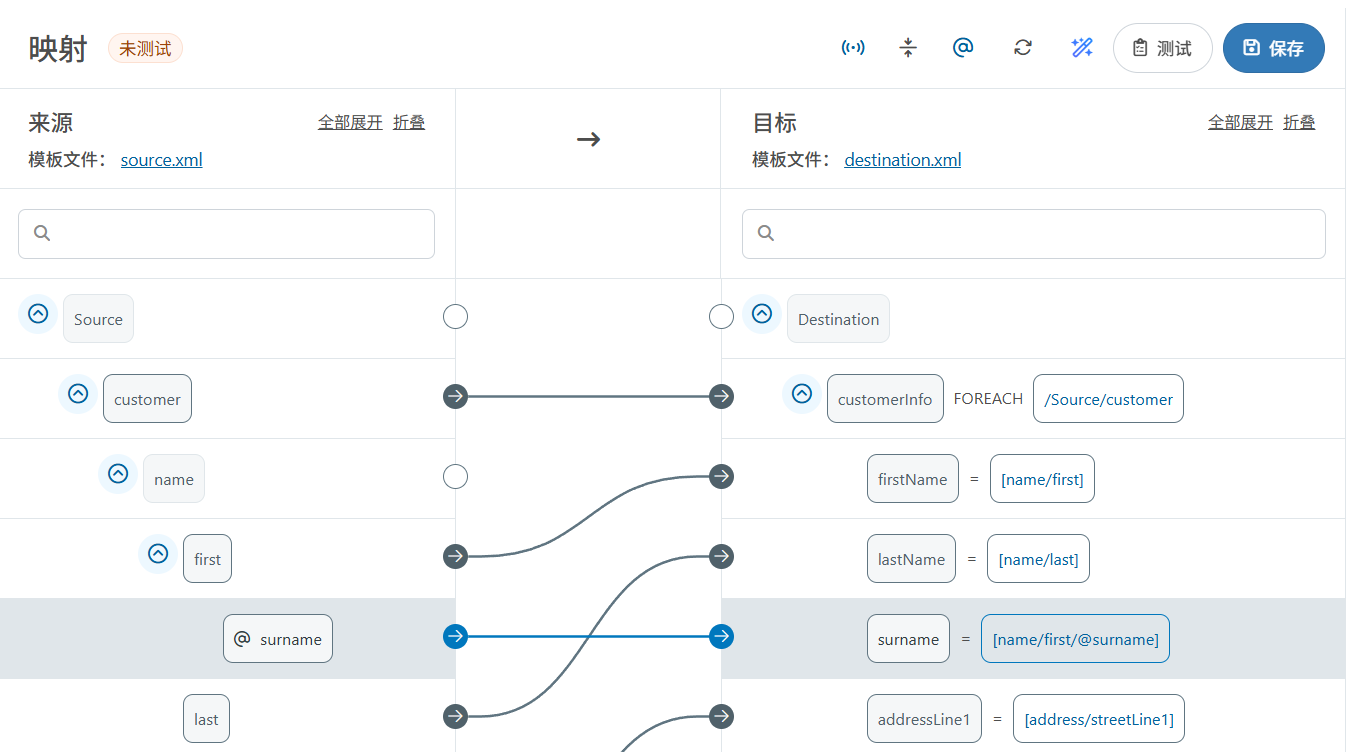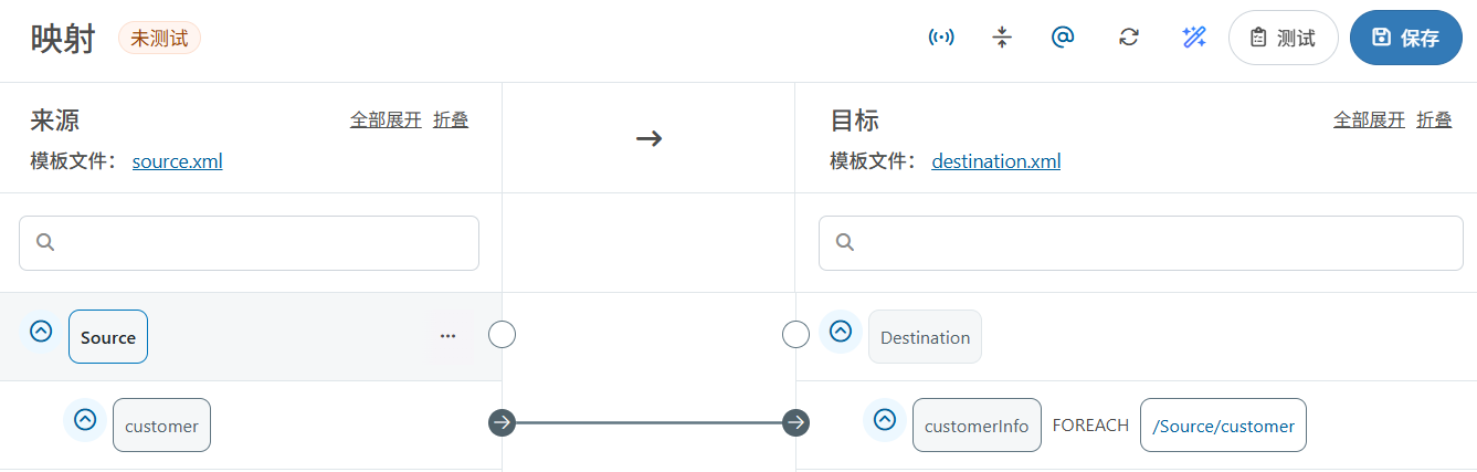 源中每次重复 customer 元素,目标中都会生成一个 customerInfo 元素,因此这些父元素应该映射在一起,形成 Foreach 关系。这样,每个 Leaf 元素的映射就很简单了: