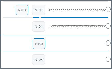 在源树或目标树中拖放元素时,拖放节点上的一条或两条蓝线会变暗/处于活动状态,如下图所示。如果两条蓝线都处于活动状态,则被拖动的节点将创建为拖放节点的兄弟。如果只有右侧的蓝线处于活动状态,则被拖动的节点将创建为拖放节点的子级。在下图中,N103 节点从 N104 下方移至 N102 节点的直接兄弟,因此两条蓝线均突出显示。