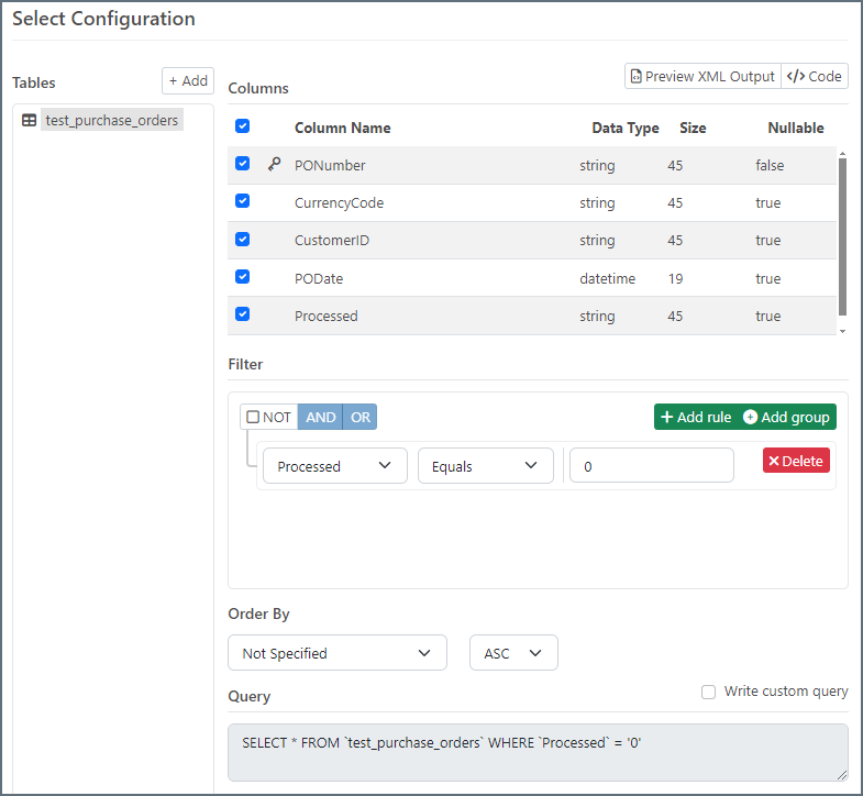 <test_purchase_orders selectQuery="SELECT * FROM `test_purchase_orders` WHERE `Processed` = 0">