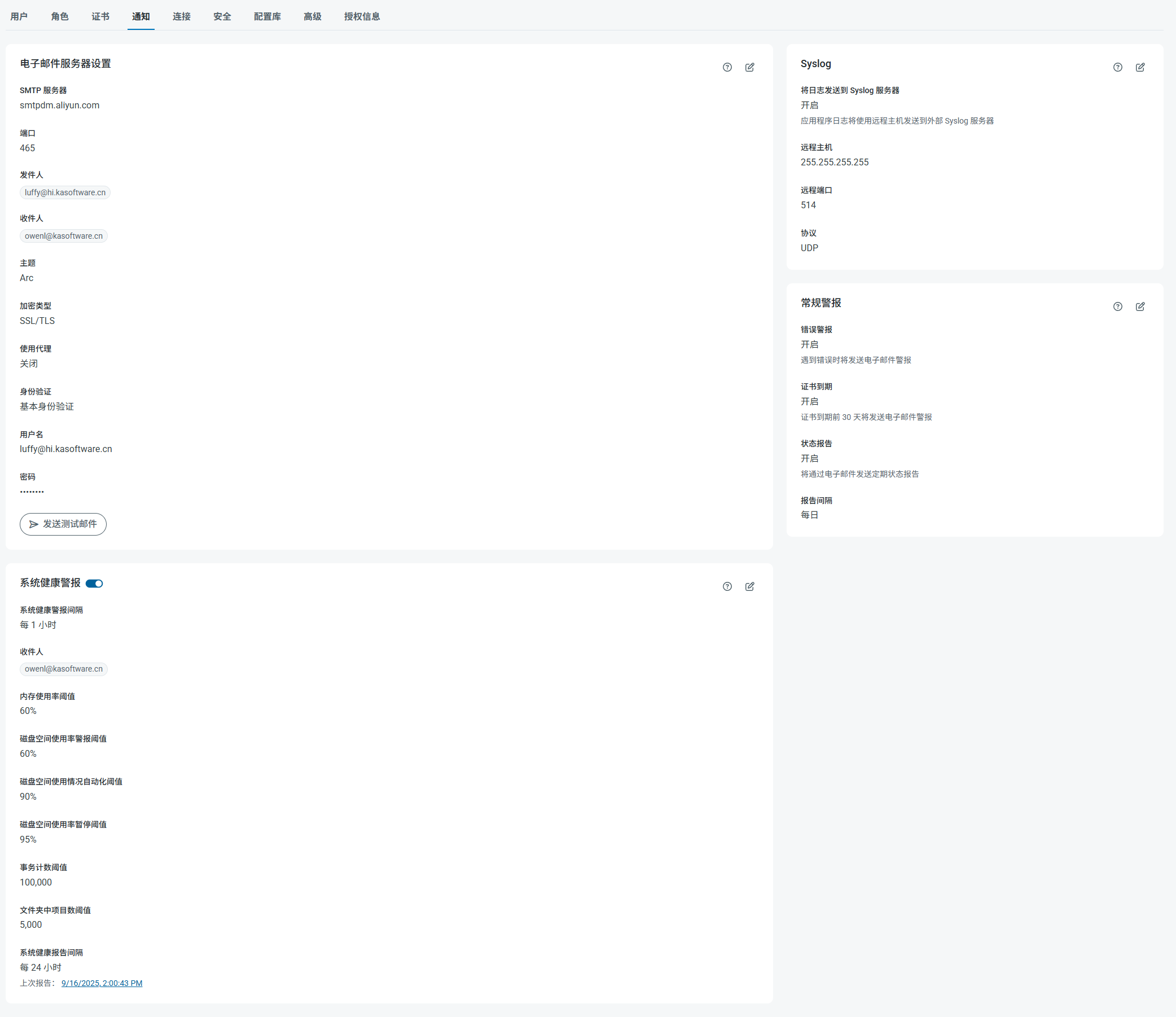 使用 通知 选项卡配置智能监控,及时了解系统健康状况、证书过期、处理错误和关键事件的警报,防止它们影响您的运营。
