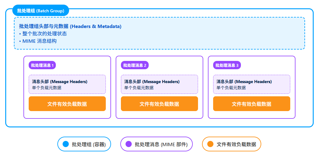 批量组中的每条批量消息都是一个包含应用程序处理的文件有效载荷数据的 MIME 部分。每条批量消息都包含与有效载荷(而非批量组)关联的元数据。批量消息具有多组元数据:一组标头用于跟踪整个批量组,另一组单独的标头用于跟踪批次中的每条消息。