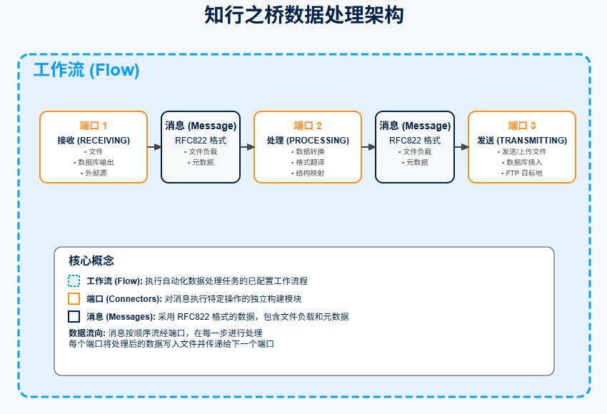 知行之桥工作流是配置好的业务流程,用于执行一组自动化的数据处理任务。工作流由多个端口组成,这些端口相互连接,使得一个端口处理的数据会自动传递给工作流中的下一个端口。