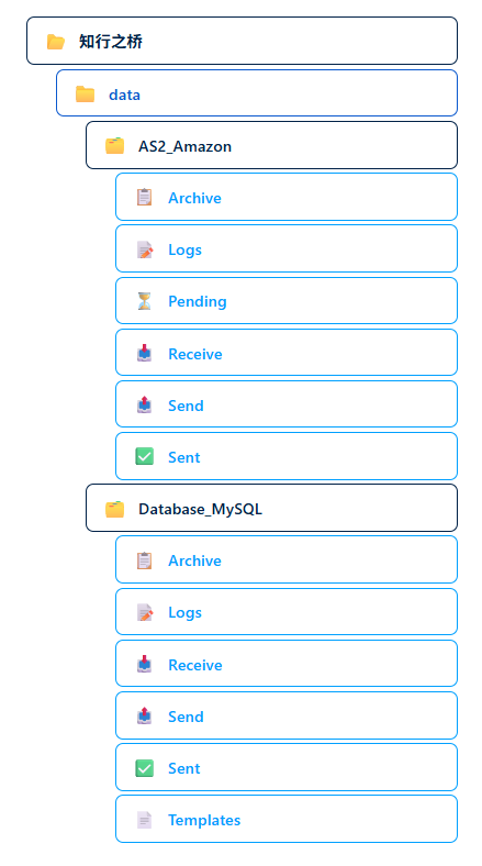 由于希望知行之桥中的数据透明且易于访问,应用程序中的特定文件应当易于查找。简单的分层文件夹结构有助于确保用户和外部系统知道在何处查找知行之桥数据文件。