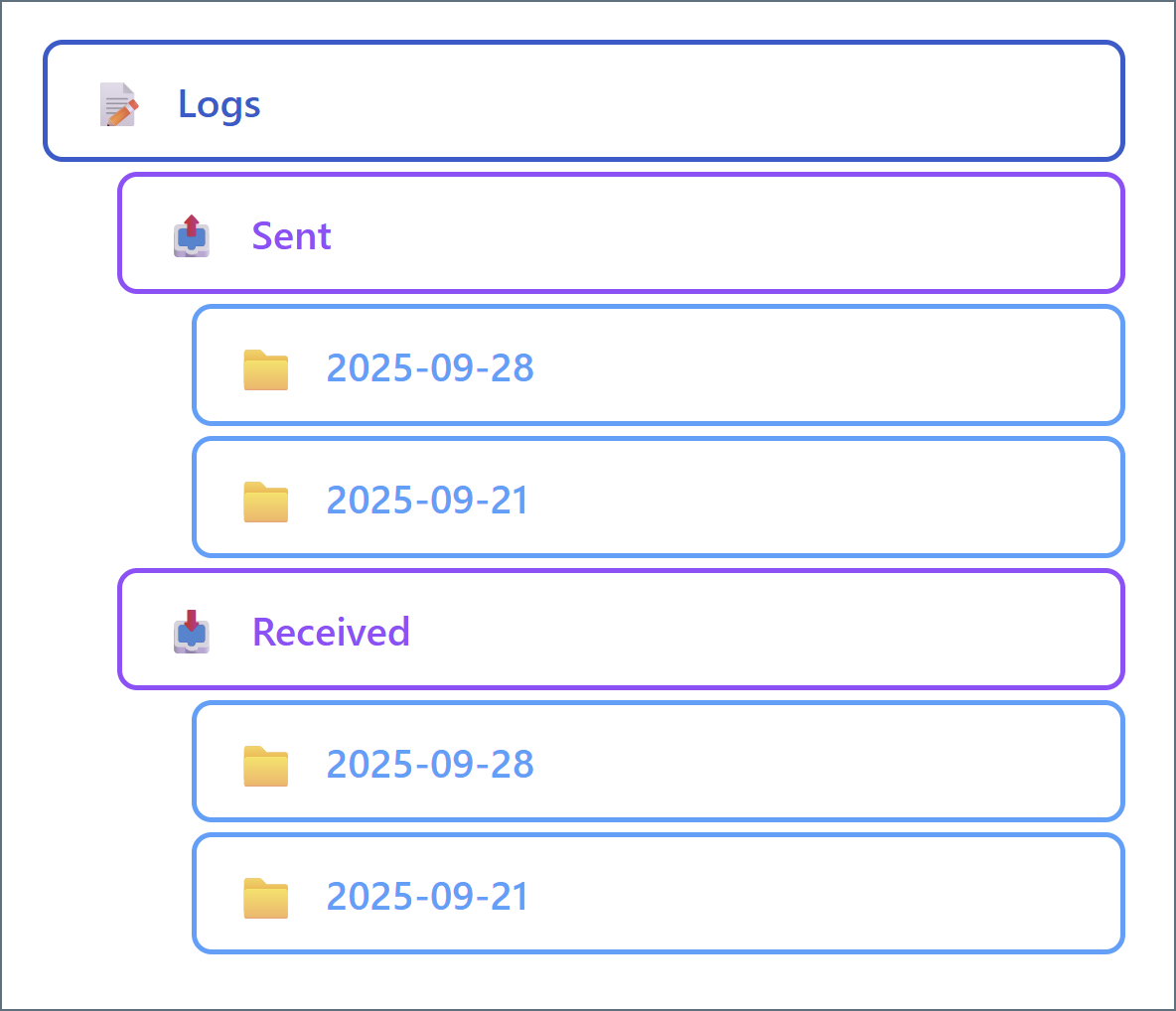 每当知行之桥处理一条消息时,它都会生成一个与 MessageId 同名的日志文件夹。此文件夹包含详细日志文件,具体的日志内容取决于发送和/或接收文件的端口类型。例如,AS2 端口除了记录代表消息本身的 .eml 文件外,还会记录 MDN 回执、原始请求和响应以及连接日志。