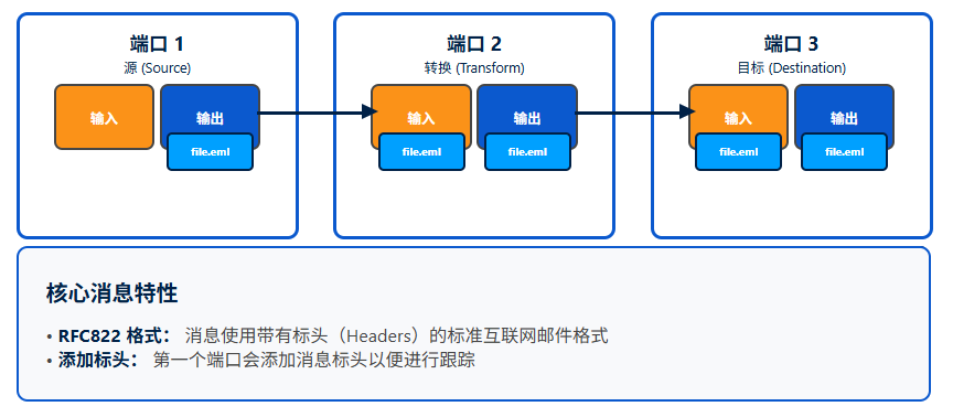 消息在消息实现中有更详细的解释,但高层核心点是:消息是标准 RFC822(互联网消息)格式的文件。当一个端口将数据传递给工作流中的另一个端口时,它将数据写入文件,然后将该文件传递给下游的下一个端口,如下图所示。