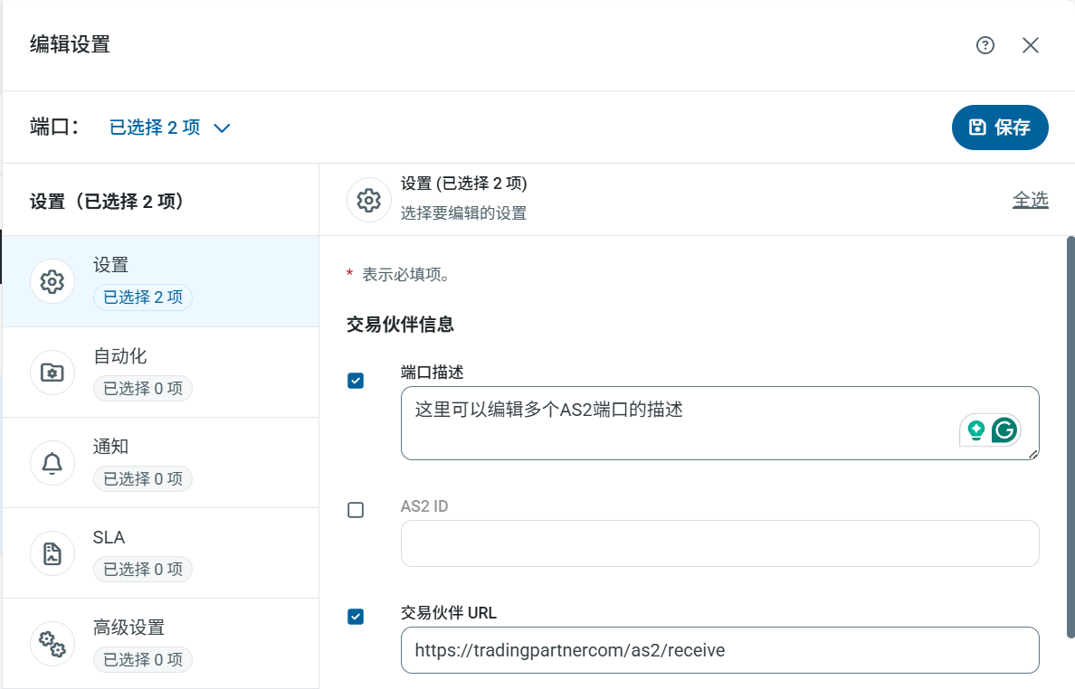 编辑设置 页面分为与创建单个端口时相同的选项卡。使用所有选项卡上的复选框来选择要编辑的字段,然后进行修改。完成后,点击 保存 (Save)。保存时,知行之桥会验证您的更改,并在将更改应用于所选端口之前报告任何警告或错误。