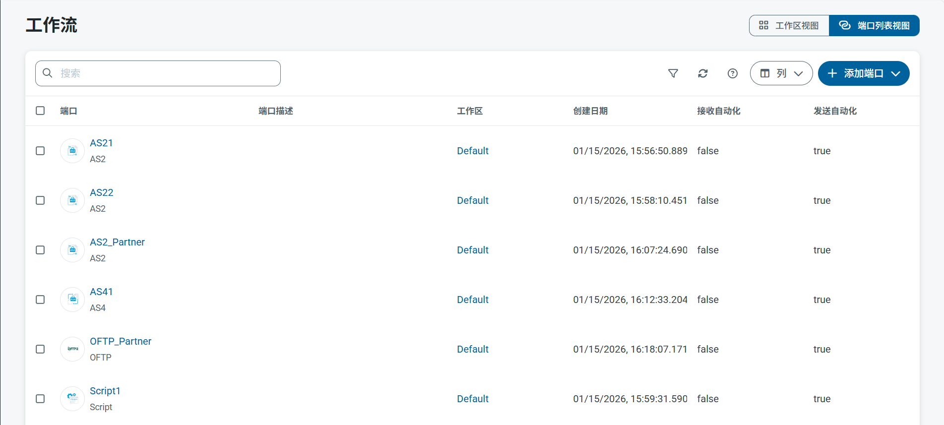 点击导航栏上的 工作流 (Flows) 以打开工作区网格,然后点击右上角的 端口视图 (Connector View),即可查看应用程序中所有端口的列表。