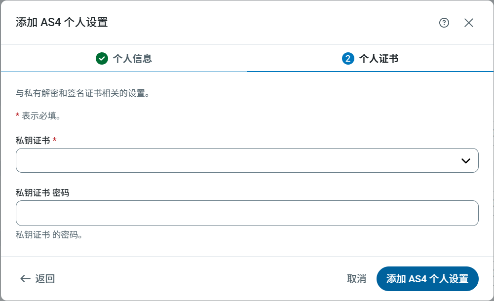 私钥证书用于数字加密(解密和数字签名)。私钥证书包含一个与公钥配对的私钥。当交易伙伴使用公钥来保护 AS4 消息时,它能确保只有持有配对私钥的人才能解密该消息。