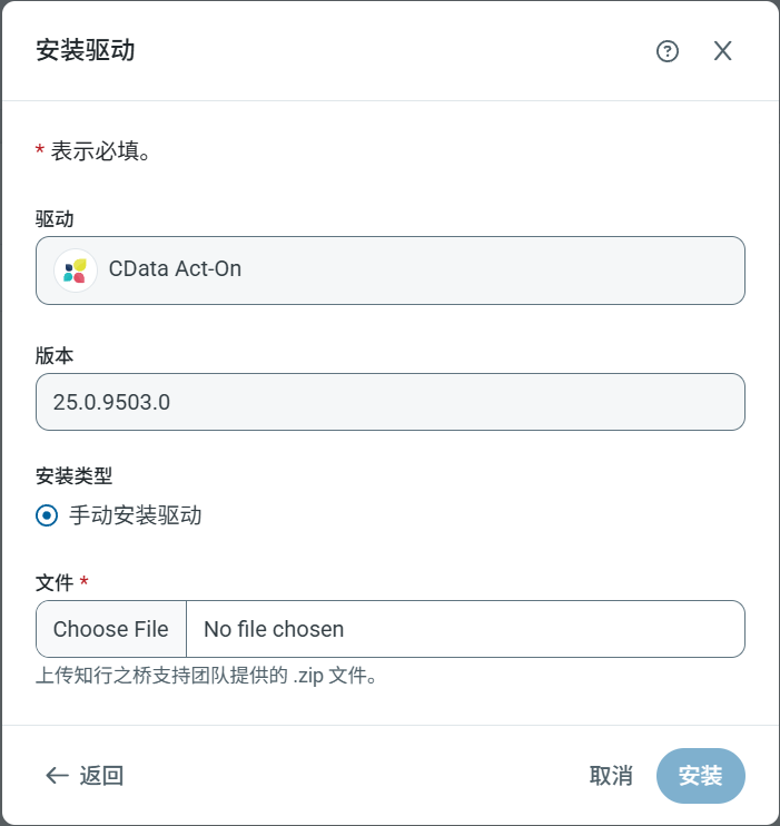 点击下载按钮后,安装端口面板会打开并说明版本号。此时,系统会询问要手动安装还是自动安装。通常建议选择自动安装。但是,如果知行之桥的技术支持已向您提供 .zip 文件,可以选择手动安装,然后使用选择文件提供该 .zip 文件。
