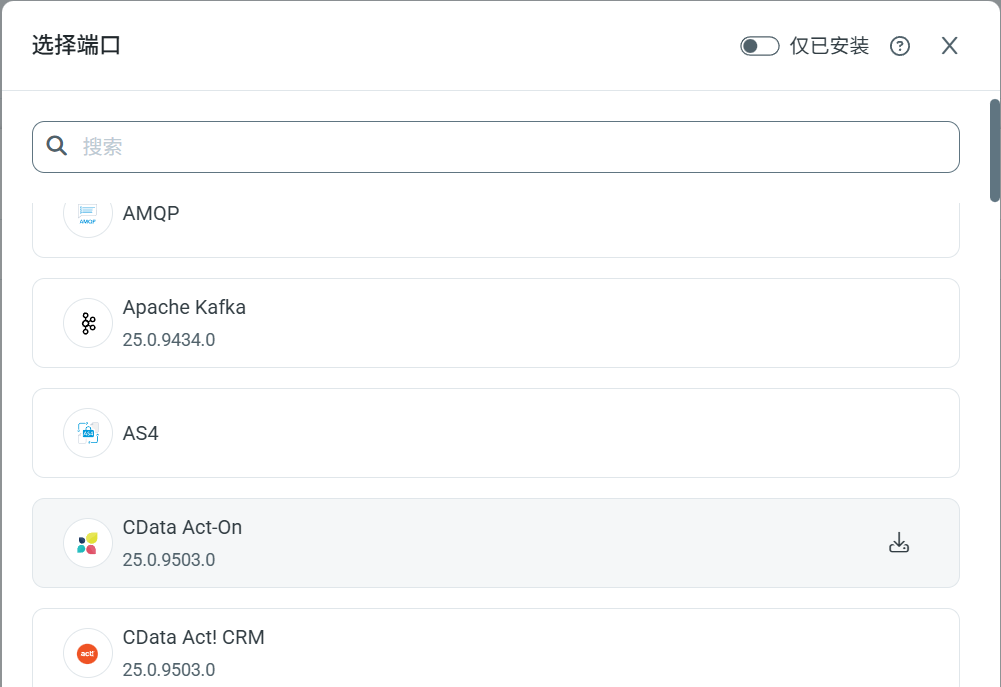 要创建新的共享连接,请点击添加连接并选择连接目标。知行之桥随应用程序附带了一些端口的驱动程序,但并非全部。在选择端口面板上,如果需要的端口上显示下载按钮(如下图中的 Act-On 端口所示),请使用该按钮下载并安装驱动程序,从而启用该端口。