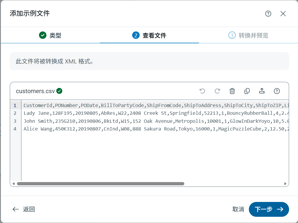 点击 下一步。转换和预览 会显示转换为 XML 的示例数据预览。对示例满意后,点击 添加。