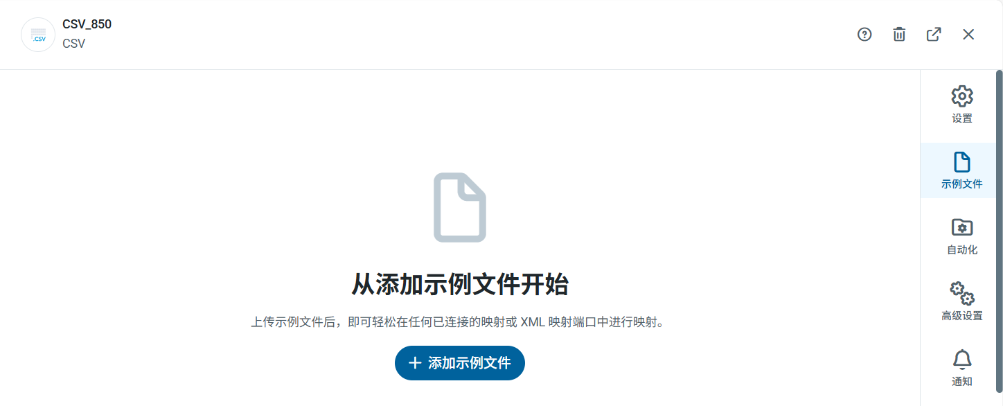 导航到 CSV 端口的 示例文件 页面,然后点击 添加示例文件。如果已经有一个包含适当列(以及标题,如果启用了 包含列标题)的示例 CSV 文件,请选择 文件上传 并浏览文件。或者,选择 手动创建 直接在应用程序中创建 CSV 文件。如果选择 手动创建,请为示例文件命名。点击 下一步。