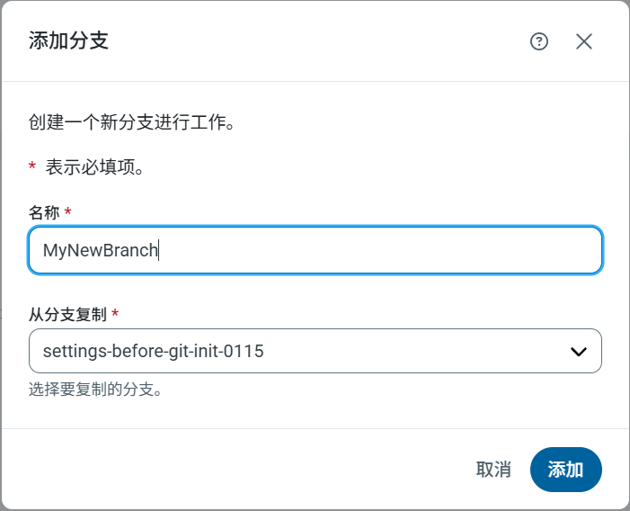 点击 添加分支 并输入分支 名称。选择要从中复制的分支,然后点击 添加。