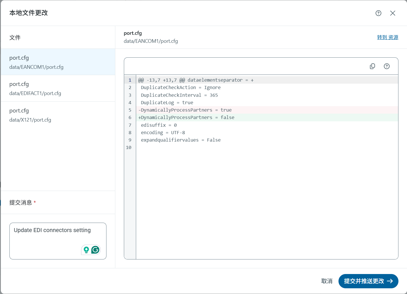 文件更改 页面上的 转到资源 链接将带至知行之桥中发生文件更改的部分。例如,如果正在查看 AS2 端口的 port.cfg 文件差异,点击该链接将跳转到该 AS2 端口。