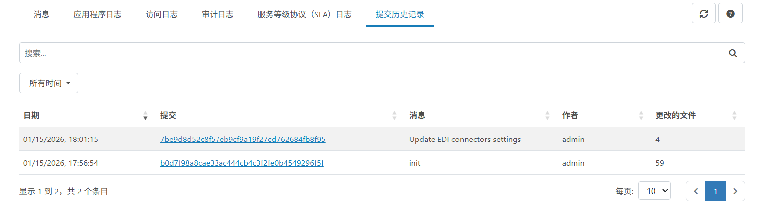 启用版本控制后,活动 页面上会出现 提交历史 页面。它显示完整的提交历史记录,并提供提交哈希、提交信息、作者、日期和时间以及每次提交中更改的文件列表等详细信息。可以在此页面上搜索和过滤内容。