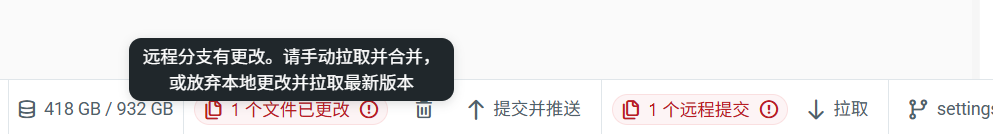 当有本地更改需要推送,同时也有远程更改需要拉取时,可能会产生冲突。工具栏会反映冲突情况并提供操作建议。同样的错误消息也会出现在 提交 和 拉取远程提交 预览页面上。