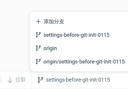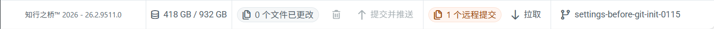 在环境中实施版本控制后,标准的知行之桥页脚将变为状态栏,显示 Git 指标和操作,例如本地文件更改数量、远程提交数量以及当前分支。