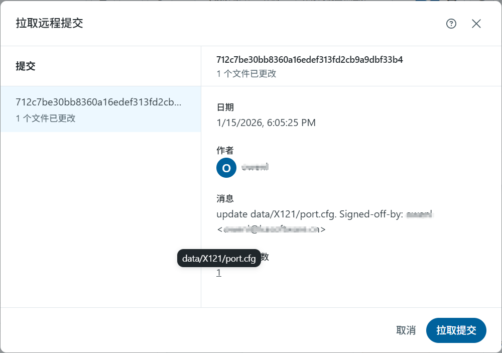 拉取远程提交 预览列出了所有待拉取的提交。点击某个提交可查看其详情,将鼠标悬停在文件数量上可查看该提交中包含哪些文件。点击 拉取提交 (Pull Commits) 完成任务。