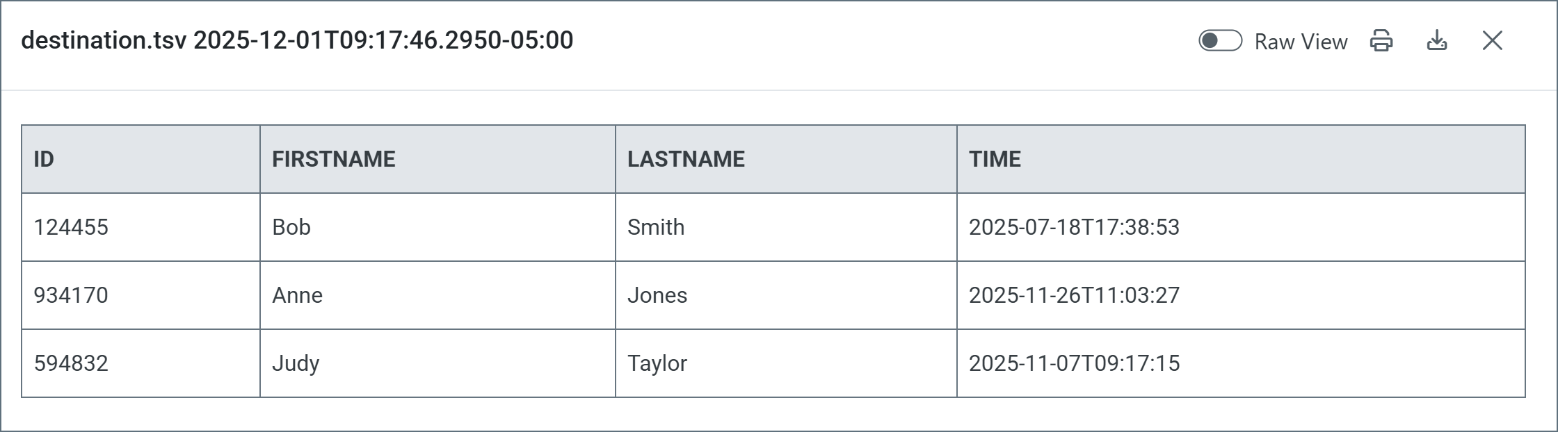 某些 TSV 文件包含一行消息头信息,为文件中的值提供上下文。 当启用 存在列标题 设置时,将解析此标题行,并将解析后的标题用作值元素(记录元素的子元素)的元素名称。 否则,值元素将被赋予通用名称,例如 field_0、field_1 等。