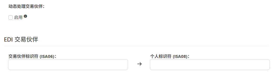 - 交易伙伴标识符 (ISA06) 标识 X12 通信中的发送方(生成 X12 文档时,此处应为您自己的标识符)。仅在未勾选“动态处理交易伙伴”时适用。