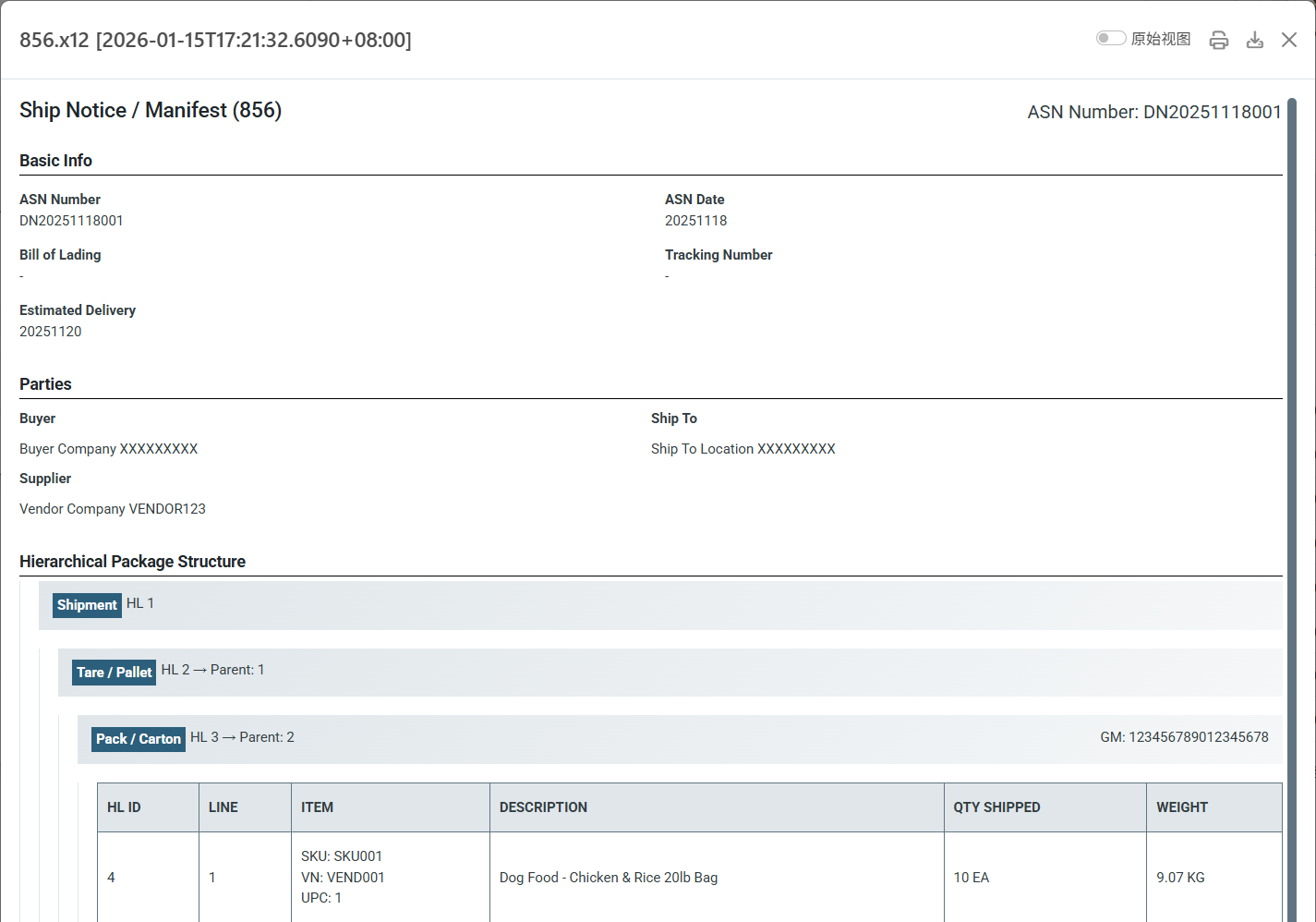 - InterchangeReceiverId: 接收方 ID(ISA08)。