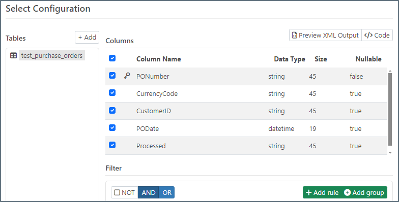 在 MySQL 端口 设置 选项卡上,将 操作 设置为 SELECT。在 SELECT 配置 部分中,单击 添加 以配置操作。这将显示数据库中的表列表。选择父表(包含 PO 数据)。稍后添加子表(包含行项目数据)。在此示例中,PO 表为 test_purchase_orders,选择此表将填充配置部分的 列 部分。