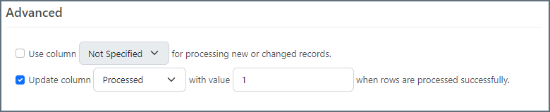 除了根据Processed列来过滤记录,该列需要被更新,这样一来记录不会被重复提取。映射编辑器底部的高级部分允许特定一列,当成功从数据库中读取行时,该值将被更新。