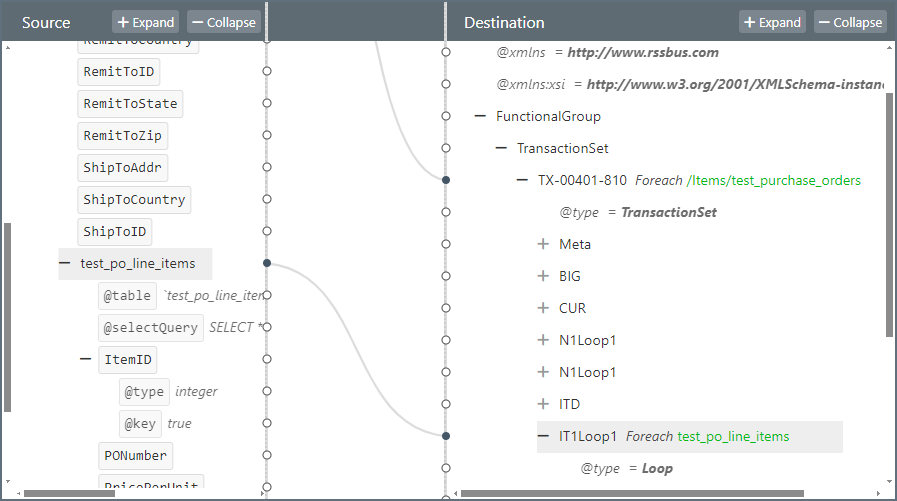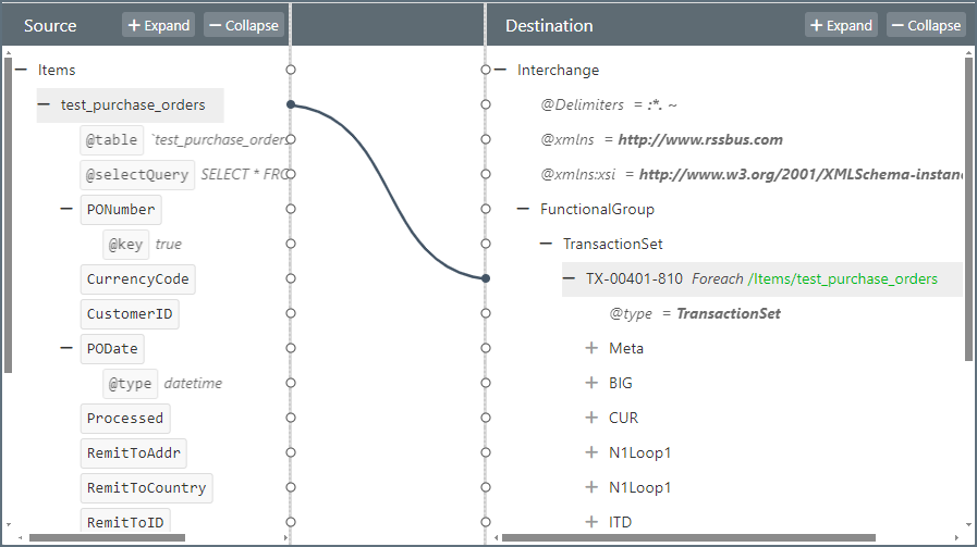 在这种情况下,从 PO 表 (test_purchase_orders) 中提取的每条记录都会在生成的 EDI 中产生一个新的交易 (TX),而从订单项表 (test_po_line_items) 中提取的每条记录都会产生一个新的 IT1Loop。将 test_purchase_orders 元素拖到 TX-00401-810 元素上,如下图所示: