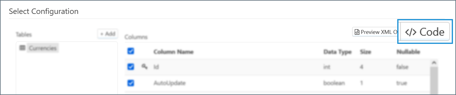 在 SELECT 映射,在所有记录被 SELECT 插入表之前或之后,可以自动发生的查询。如要配置此功能,首先点击在 Select 配置 上的 </> Code。