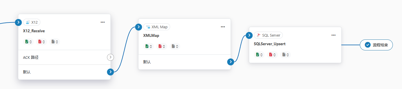 XML Map 端口通常位于工作流流中的其他两个端口之间。通常最好使用流中围绕 XML Map 端口的两个端口生成模板文件。例如,以下流程有一个 XML Map 端口将 X12 文件映射到数据库插入: