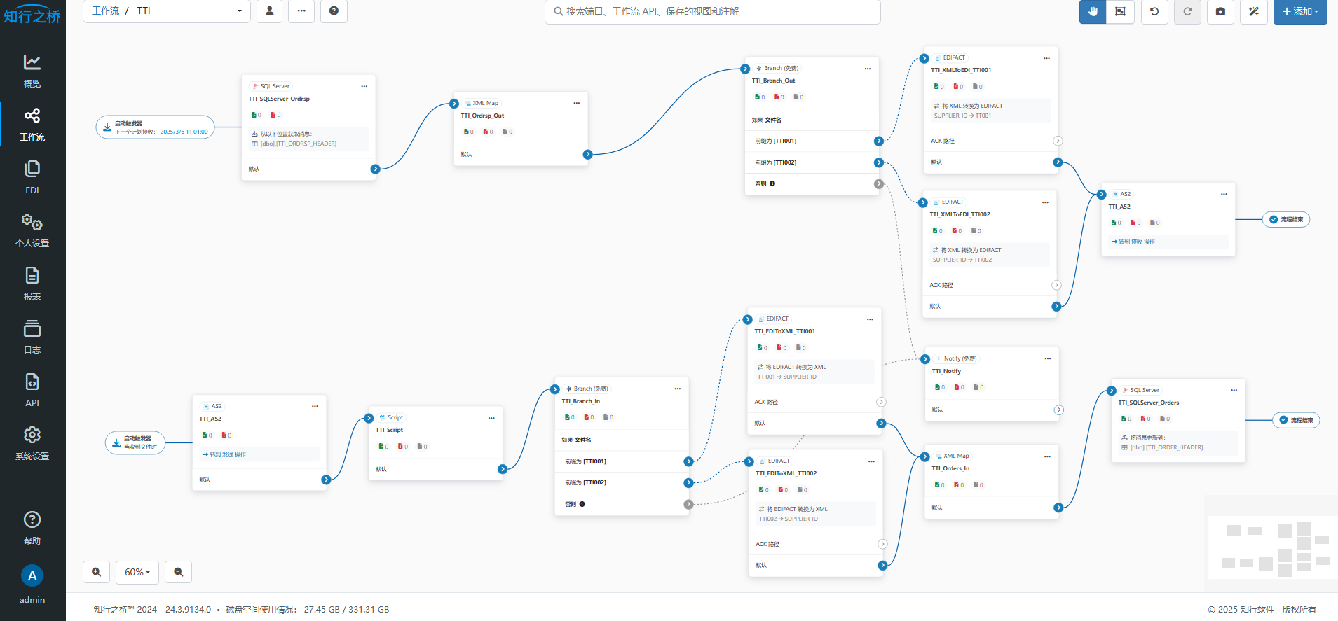 报文接收:通过知行之桥EDI系统AS2端口与TTI系统建立AS2连接,实时接收ORDERS采购订单报文。