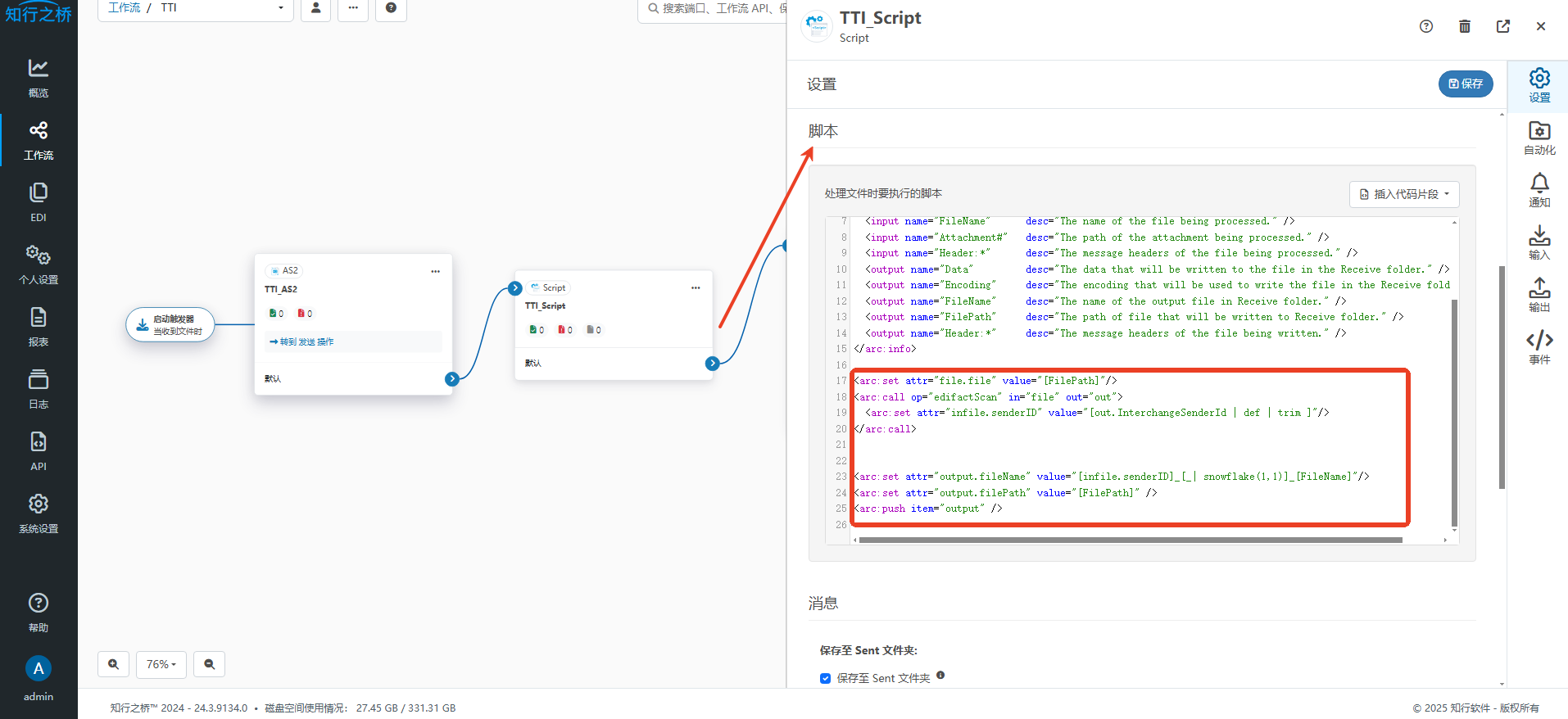 通过AS2端口接收文件之后,在Script端口的 脚本 下添加以下代码: