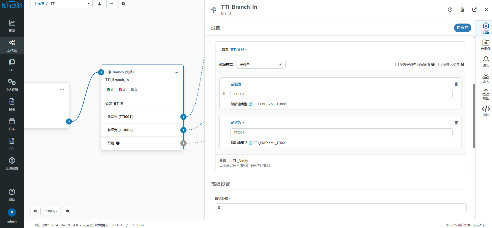 路由规则:在EDIFACT端口前添加Branch端口,在Branch端口的 设置 选项卡下设置判断条件。选择对 文件名称 进行判断,数据类型选择为字符串。当前前缀为 TTI001时,文件将会被分流至专用于处理 ISA ID 为 TTI001 的 EDIFACT端口中;当前缀为 TTI002时,文件将会被分流至专用于处理 ISA ID 为 TTI002 的 EDIFACT端口中。