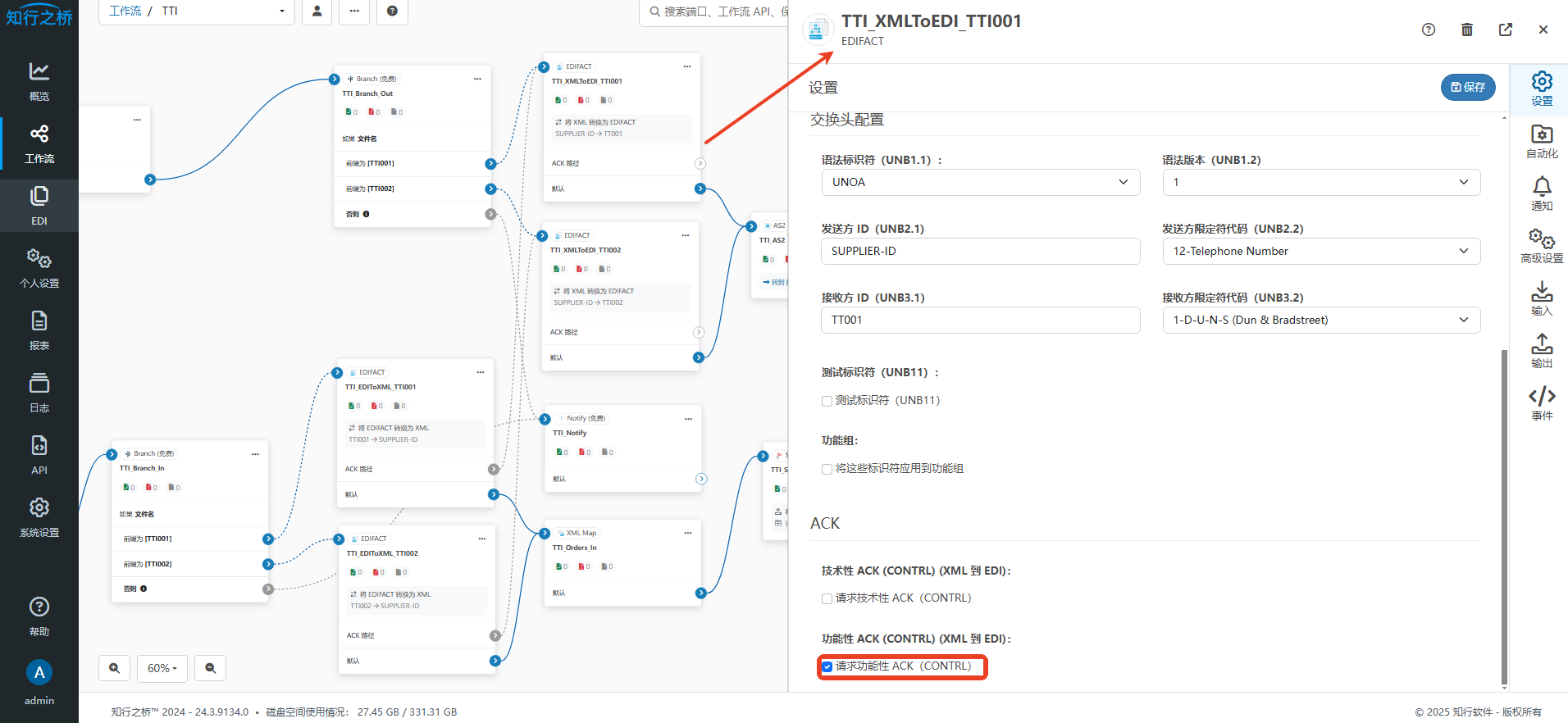 知行之桥EDI系统支持配置技术性ACK以及功能性ACK,在TTI的EDI项目中,只需要在EDIFACT端口的 设置 选项卡下勾选 请求功能性ACK 即可。