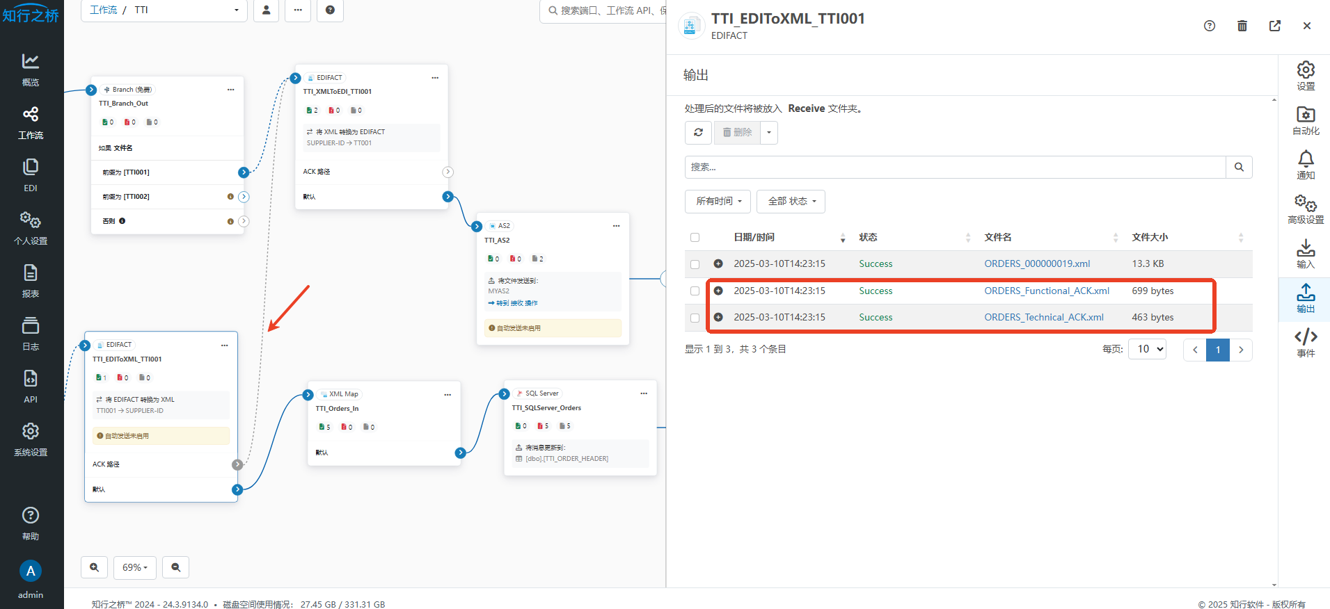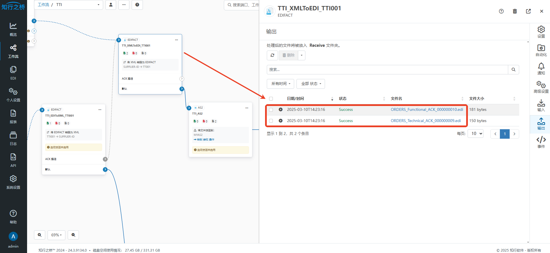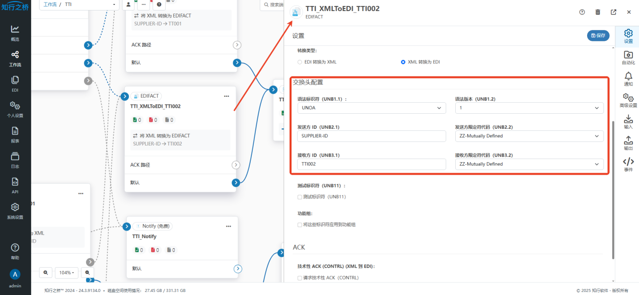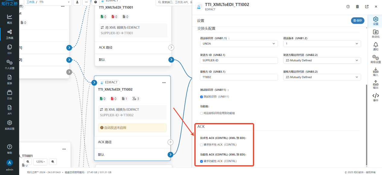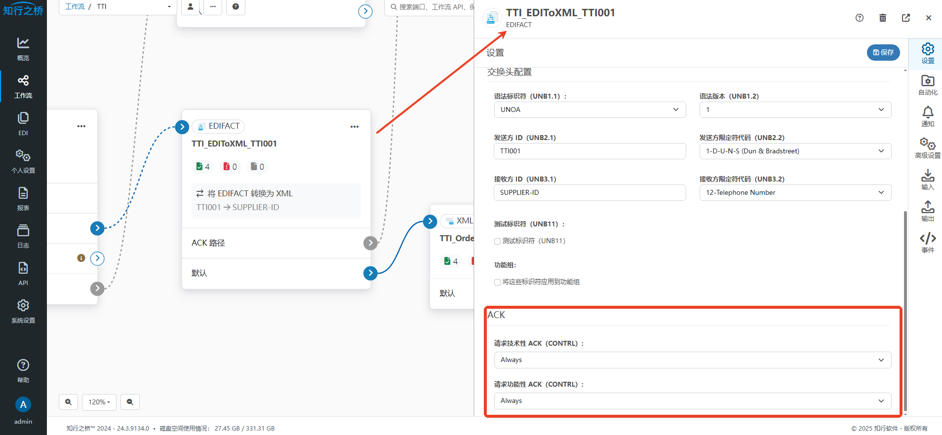 该ACK XML会通过灰色虚线路由到 XML 到 EDI 模式的EDIFACT端口,被转换为EDI文件之后通过AS2端口自动发给交易伙伴。