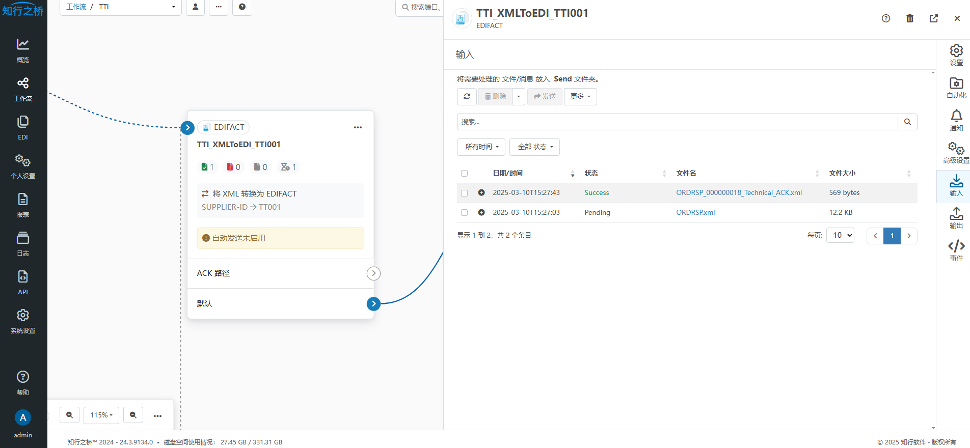 在文档传输到交易伙伴时保持为 Pending 状态。交易伙伴根据其业务逻辑处理传输,并根据配置的转换配置创建 ACK。返回 EDI格式的ACK 后,进入到EDI转换为XML模式运行的EDIFACT端口,得到XML格式的ACK。